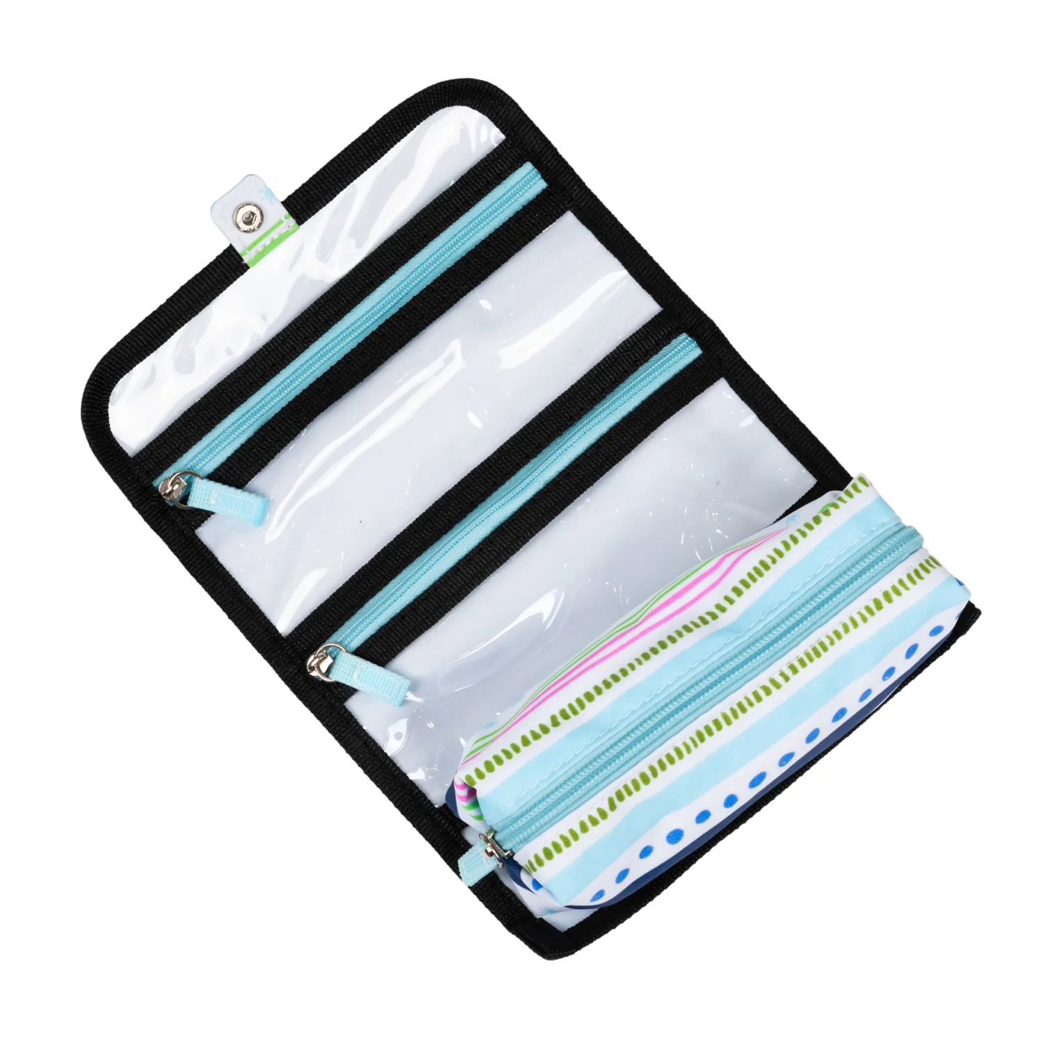 - Three zipper compartments (two clear)